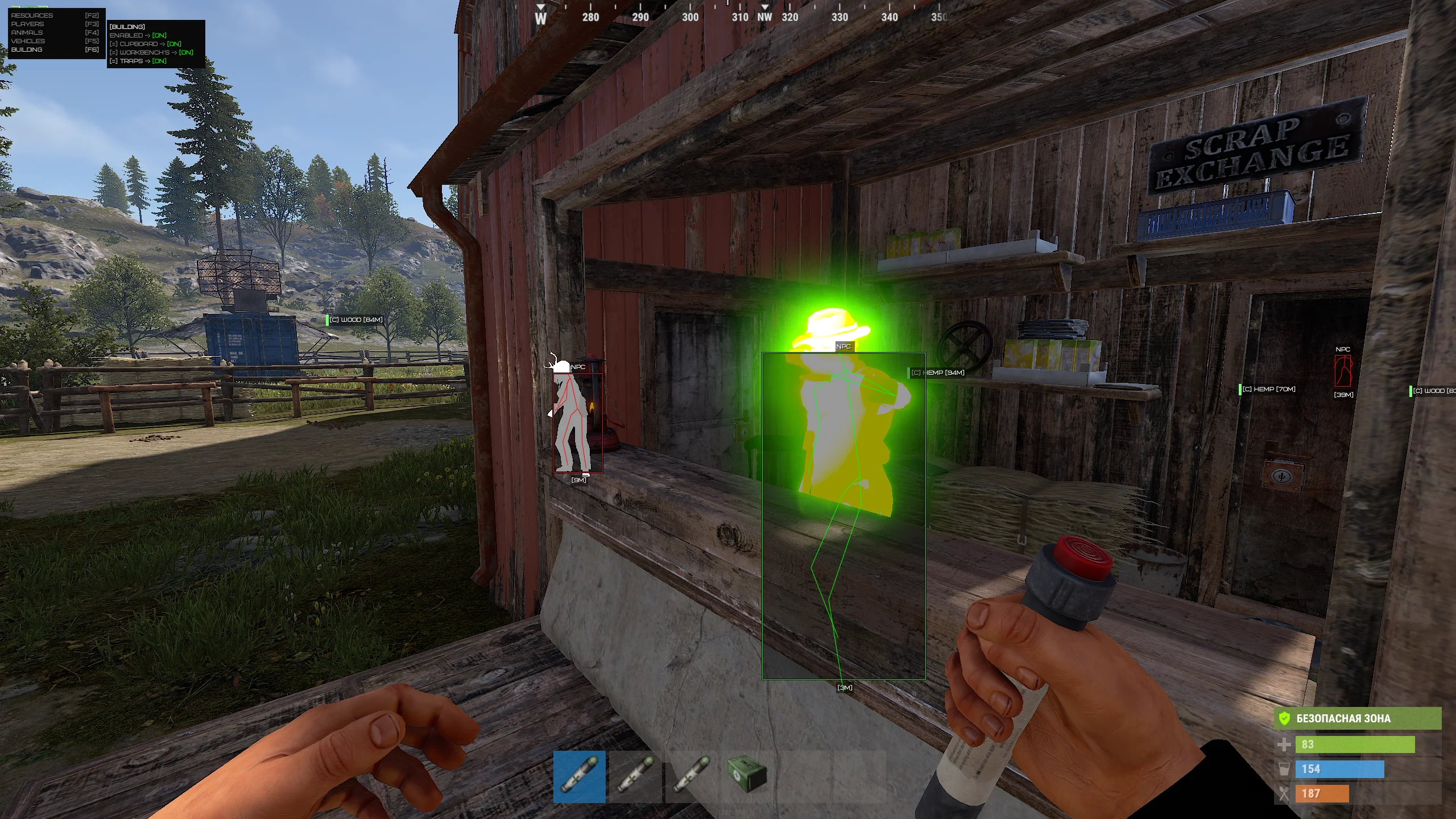 Combat capabilities are complemented by expanded ESP: players, resources, vehicles, structures, raid elements, and world objects. For added convenience, Radar and Night Vision are provided, enhancing situational control in difficult conditions and at night.